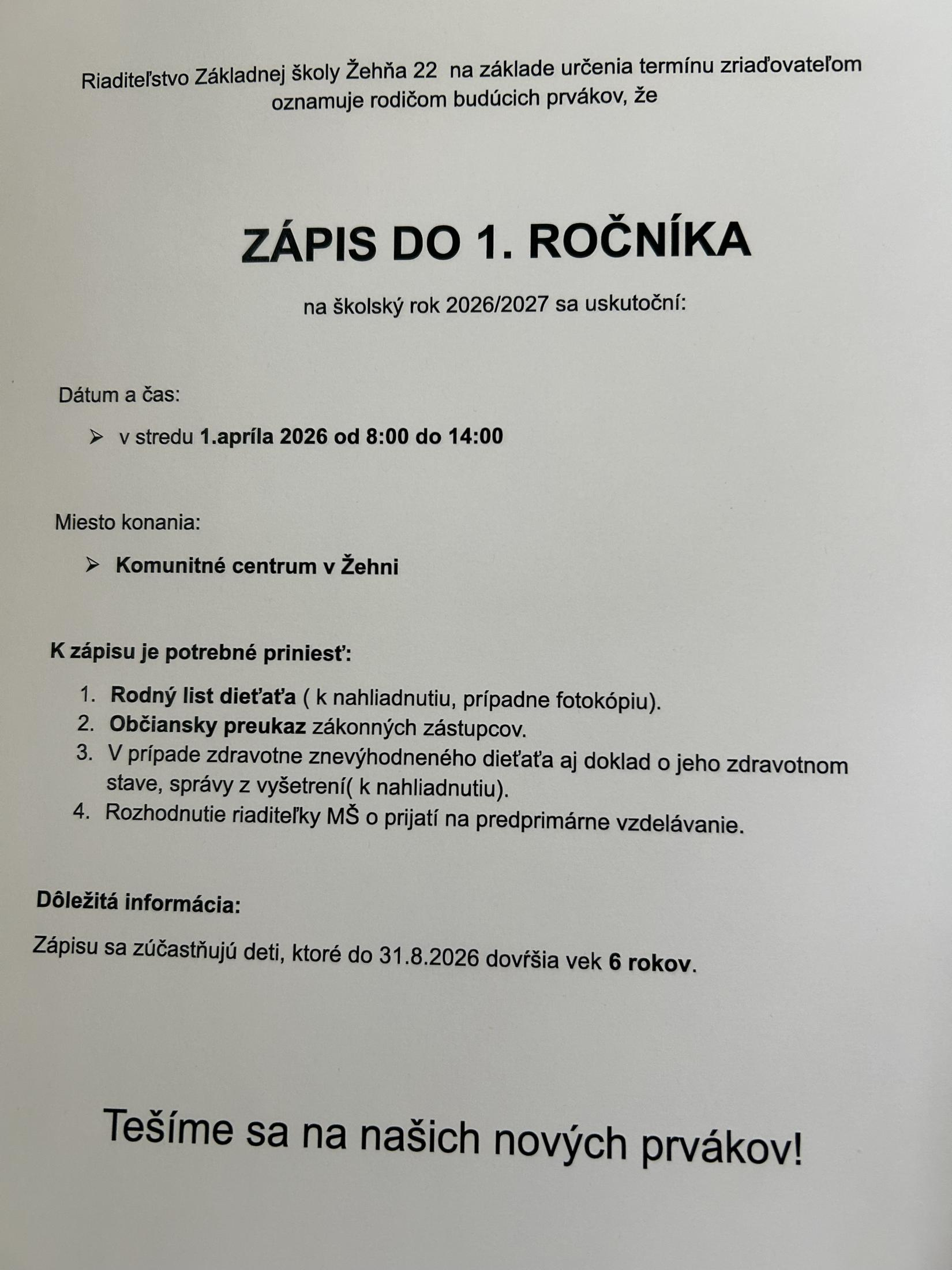 Zápis detí do 1. ročníka Základnej školy v Žehni